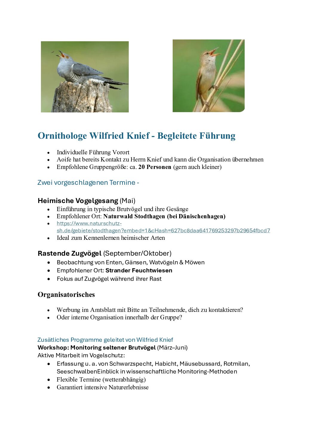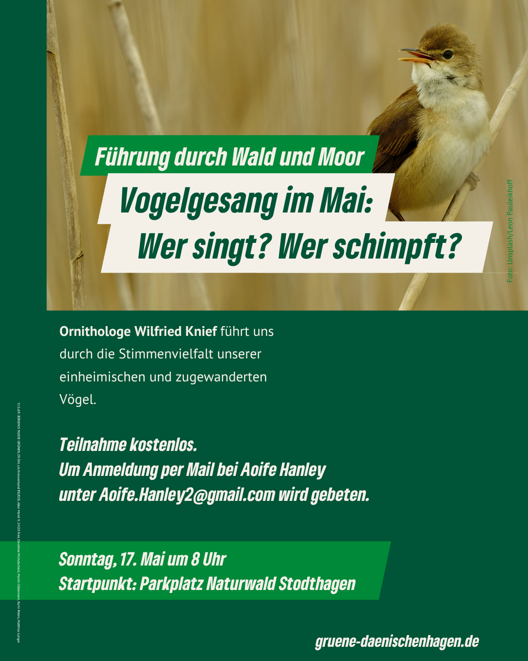 Unter fachkundlicher Führung des Ornithologen Wilfried Knief vom NABU lassen wir uns die Stimmenvielfalt der einheimischen und zugewanderten Vogelarten im Naturwald Stodthagen hören, zeigen und erklären.